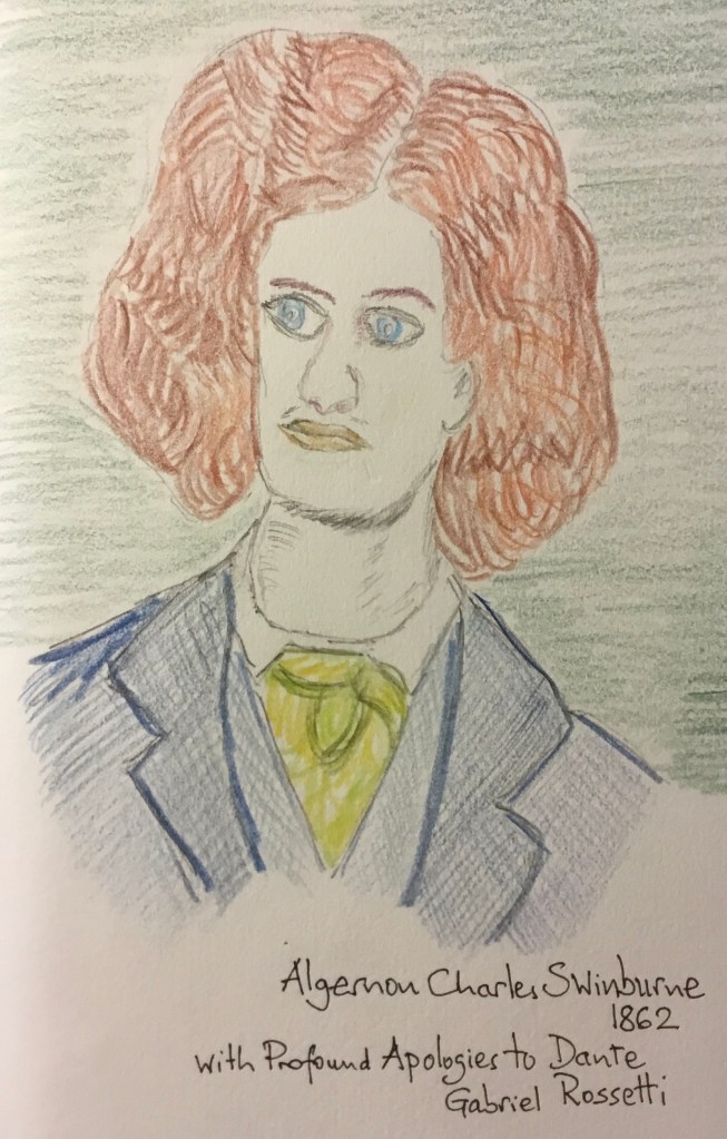 And today I’m feeling disillusioned as I think about poor old Swinburne who didn’t die young and had a rather miserable old end. He had some alarming sexual proclivities, it’s true, and once spread a rumour that he had had sex with, and then eaten, a monkey. But it seems he may not really have been as decadent as he pretended to be. Oscar Wilde stated that Swinburne was “a braggart in matters of vice, who had done everything he could to convince his fellow citizens of his homosexuality and bestiality without being in the slightest degree a homosexual or a bestialiser.” (And Oscar Wilde probably should know.)